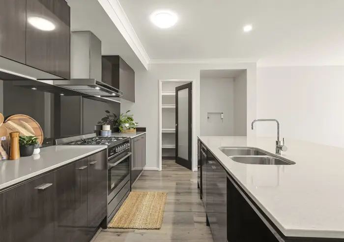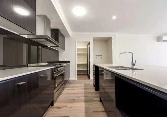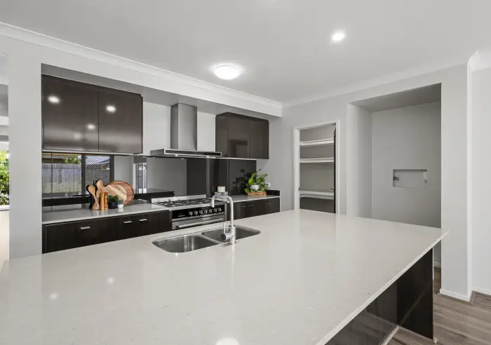 - Modern kitchen with stone benchtops, island bench, 90cm oven and 5-burner gas cooktop