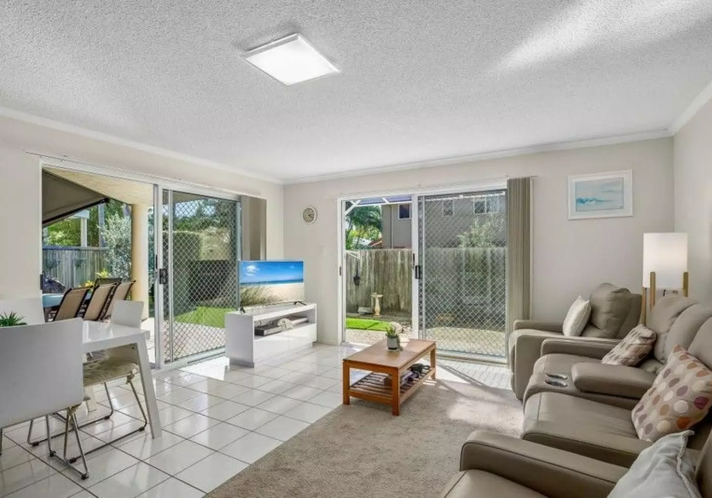 - Airy, coastal vibe with tiled living areas for easy care